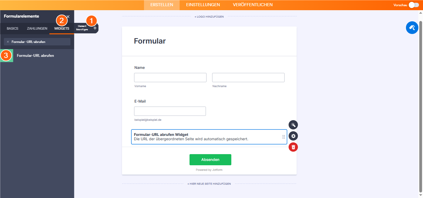 Widget Formularseiten-URL abrufen hinzufügen