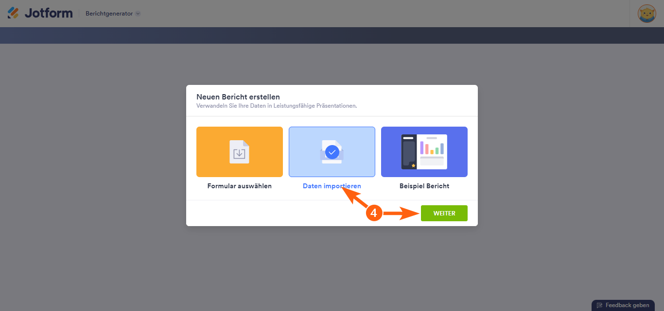- Klicken Sie anschließend im Berichtsgenerator im Fenster Neuen Bericht erstellen auf Daten importieren und anschließend auf Weiter.