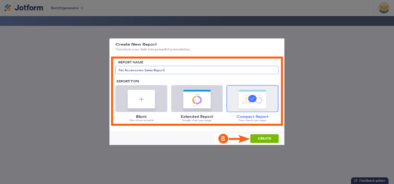 - Geben Sie anschließend im Fenster Neuen Bericht erstellen einen Berichtsnamen ein, wählen Sie einen Berichtstyp aus und klicken Sie anschließend auf Erstellen.