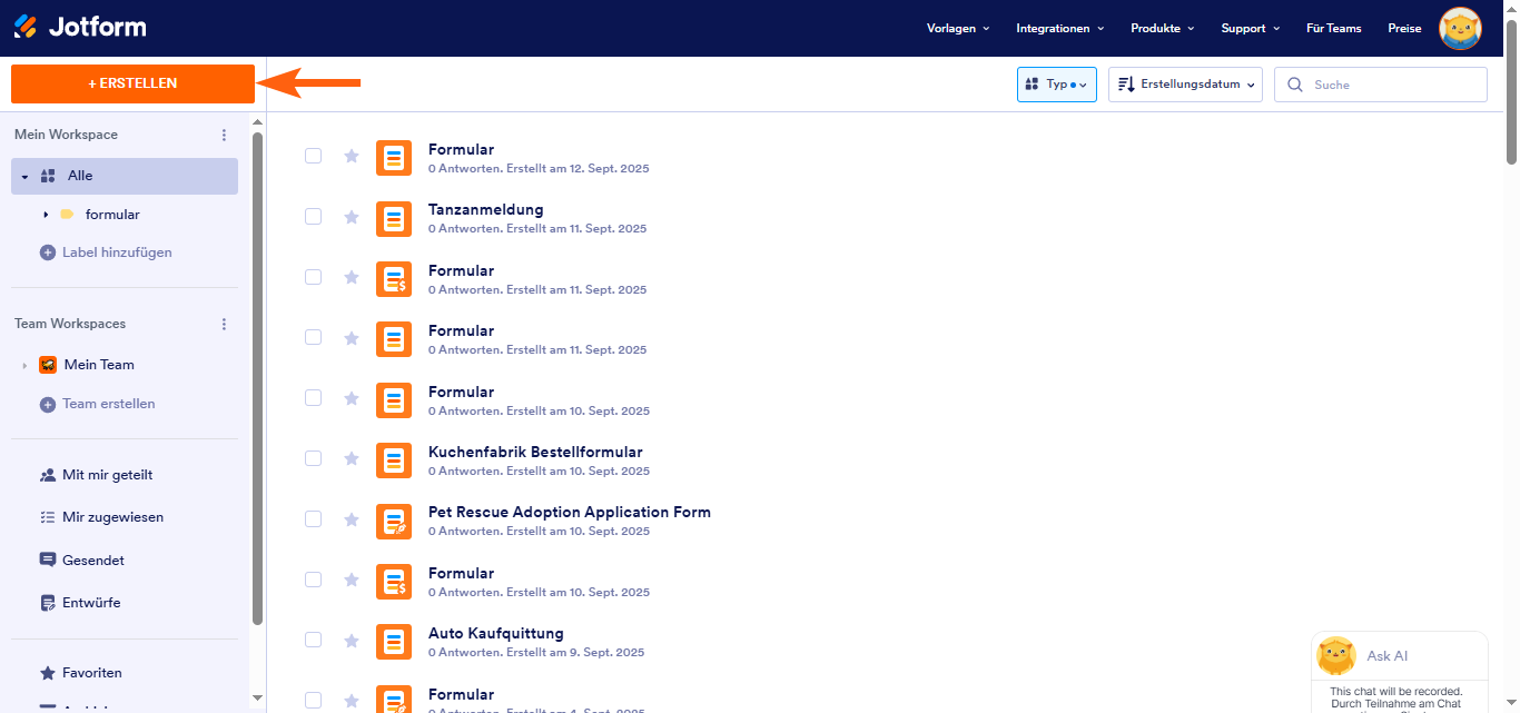 - Klicken Sie auf Ihrer Mein Arbeitsbereich oben links auf Erstellen.