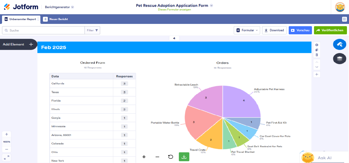 Jotform bietet eine einfache Möglichkeit, Ihre Excel- oder CSV-Daten in einen vollständig anpassbaren visuellen Bericht umzuwandeln. Sie können Ihre Daten mit Diagrammen, Tabellen, Folien und anderen visuellen Elementen zum Leben erwecken, die Ihre Informationen leichter verständlich und teilbar machen. Dieser Prozess ermöglicht einen reibungslosen Übergang von Rohdaten zu aussagekräftigen Visualisierungen und hilft Ihnen, Ihre Informationen effektiv zu analysieren und zu präsentieren – ohne komplexe Einrichtung oder Programmierung.