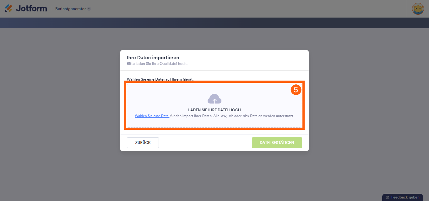 - Klicken Sie in der Mitte des Fensters Daten importieren auf Datei hochladen, um Ihre Excel– oder CSV-Datei von Ihrem Gerät hochzuladen.
