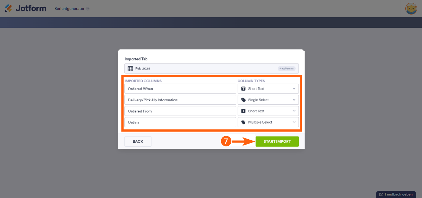 - Klicken Sie anschließend im Fenster Importiert auf das Dropdown-Menü neben einer importierten Spalte aus Ihrer Datei, um sie einem Feldtyp zuzuordnen. Klicken Sie anschließend auf Import starten, um den Datenimport zu starten. Dadurch wird automatisch ein Tabellenelement in Ihrem Konto erstellt.