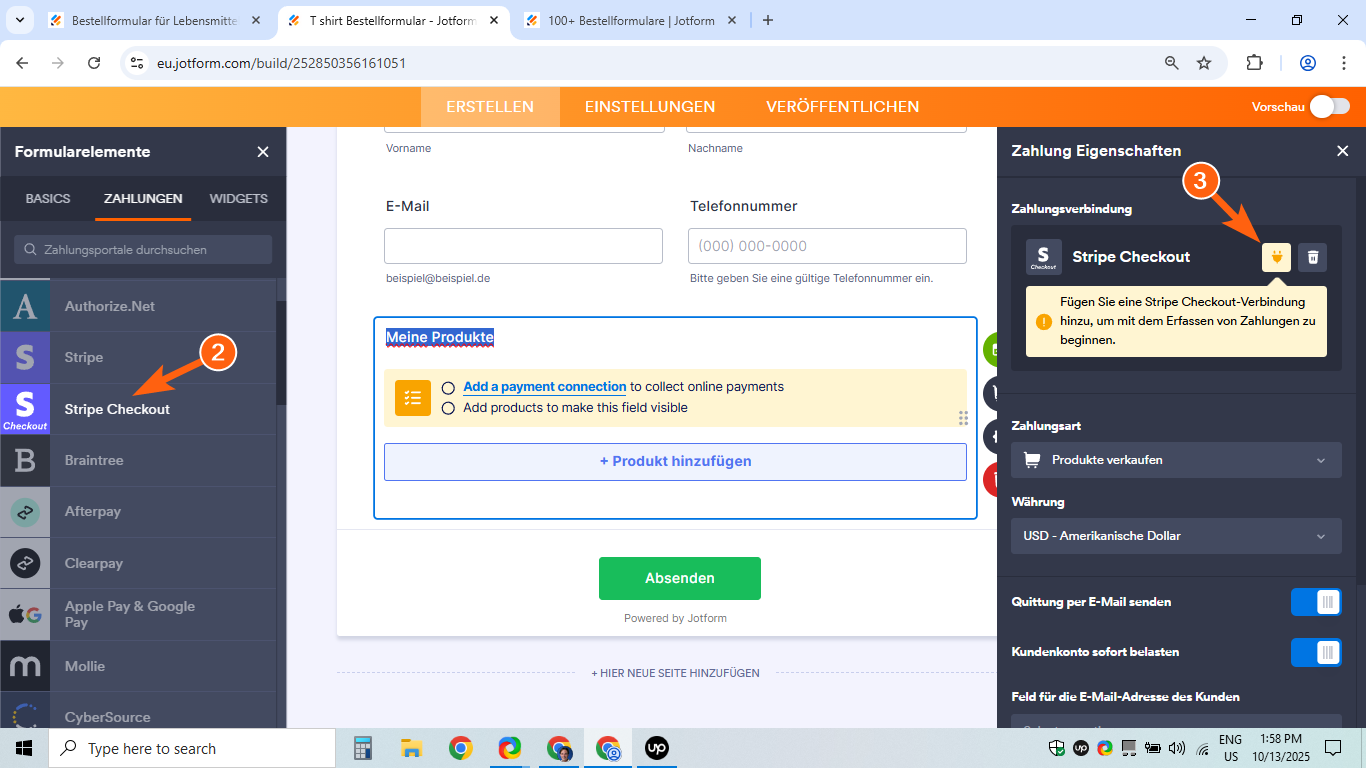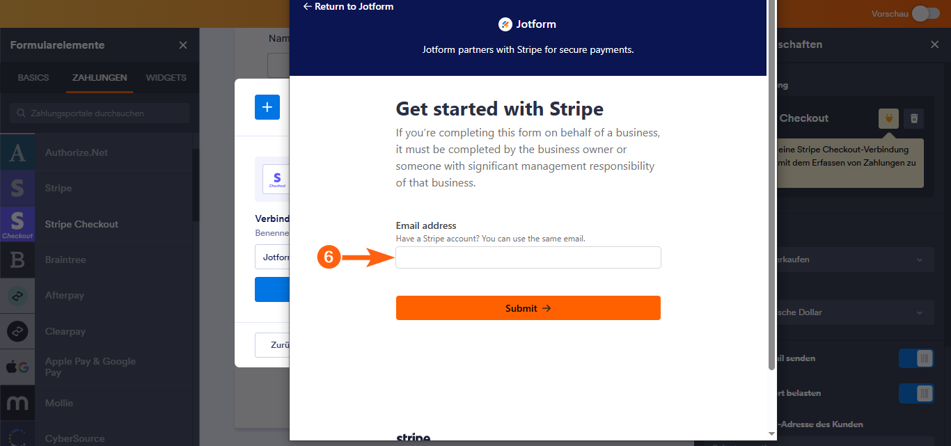 Jotform Wiederverwendbare Zahlungsverbindungen ermöglichen Ihnen die Einrichtung von Zahlungsintegrationen wie Stripe Checkout und die Wiederverwendung derselben Konfiguration für andere von Ihnen erstellte Formulare oder Apps, ohne sie erneut einrichten zu müssen. So geht’s: