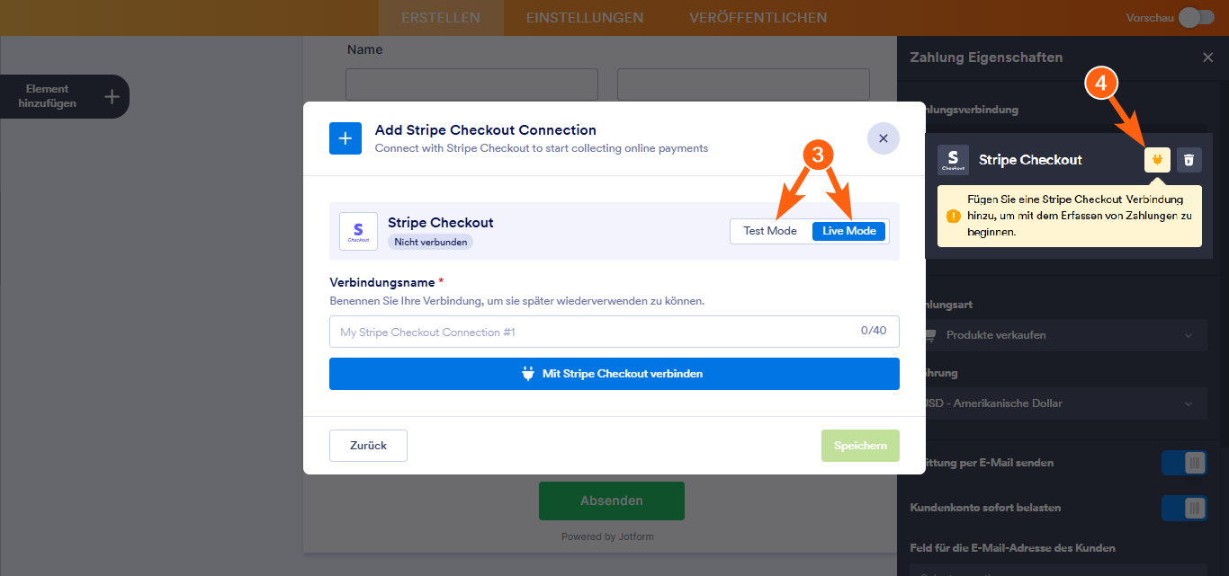 - Klicken Sie nun im Fenster Stripe-Verbindung hinzufügen oben auf Testmodus oder Livemodus, um die Umgebung für Ihre Zahlungsverbindung auszuwählen.
