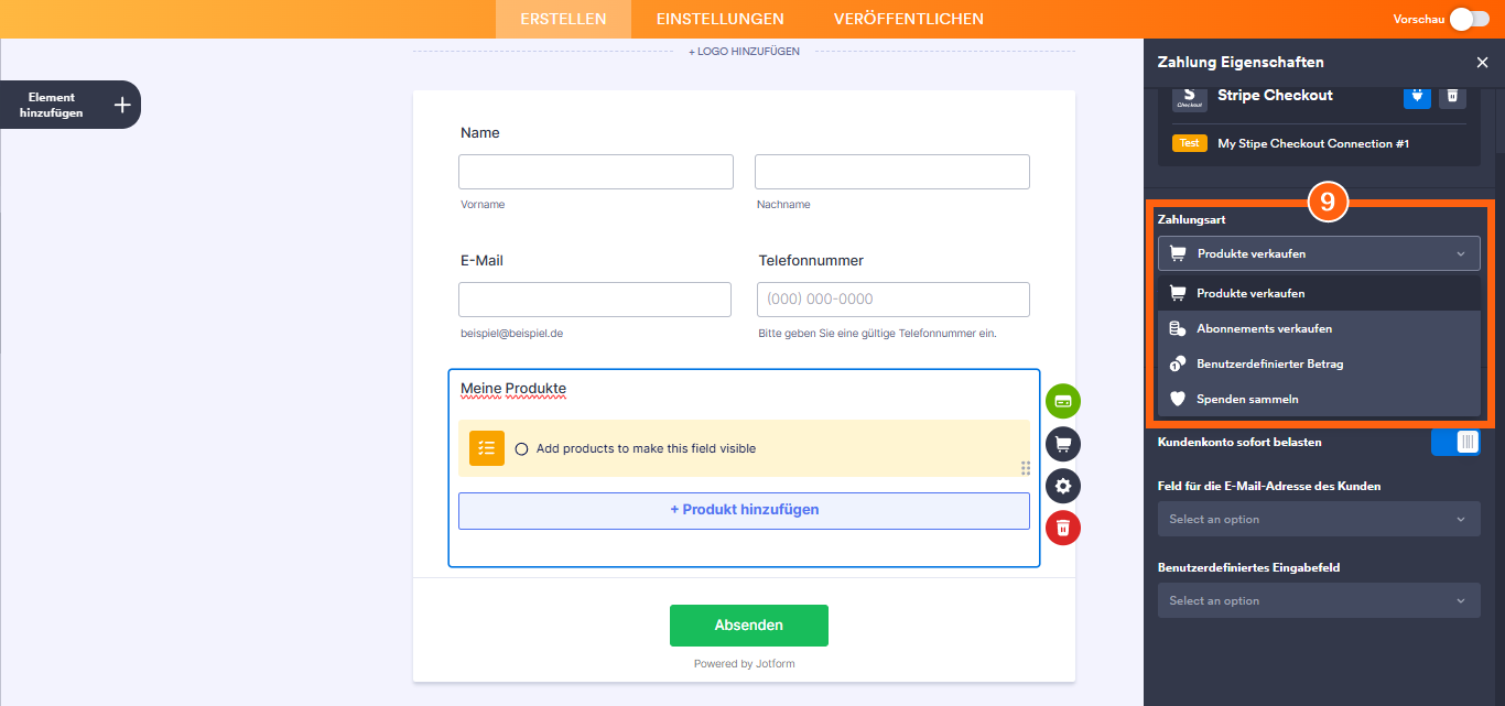 - Zahlungsart – Wählen Sie die gewünschte Zahlungsart: Produkte verkaufen, Abonnements, benutzerdefinierter Betrag oder Spenden sammeln