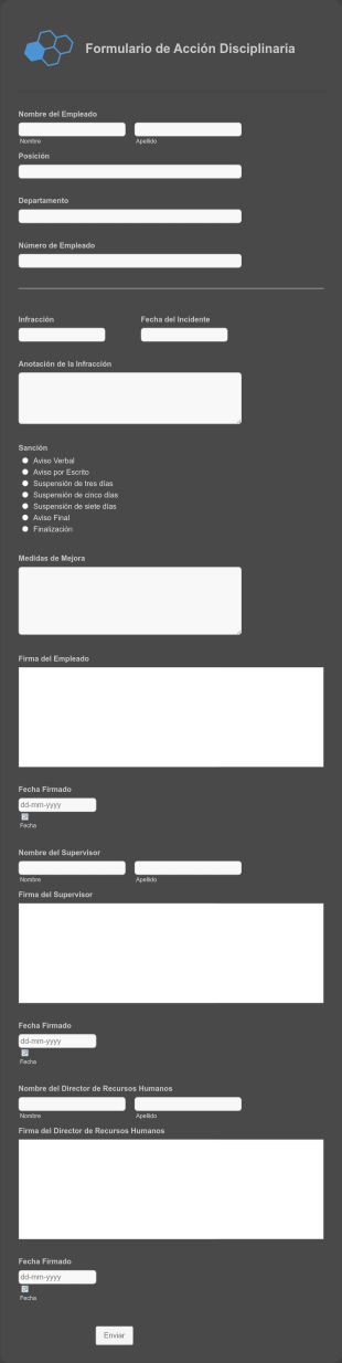 Este agente permite la recopilación de datos como el nombre del empleado, el número de empleado, la infracción, la fecha del incidente y la sanción impuesta. Gracias a su capacidad de respuesta dinámica, el agente puede personalizar la conversación en función de las respuestas del usuario, asegurando que se recojan todos los detalles necesarios. Además, las opciones de firma electrónica permiten que los empleados y supervisores completen el proceso de documentación de manera eficiente y segura.