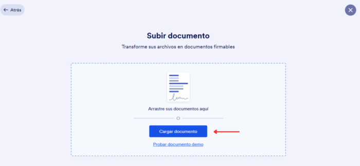 3. Arrastre y suelte su documento en el área azul o haga clic en el botón Cargar documento. También puede cargar un documento de demostración para probar cómo funciona Jotform Firmas, simplemente haciendo clic en el botón Probar documento demo.