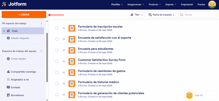 1. En Mi Espacio de Trabajo, haga clic en el botón + Crear
