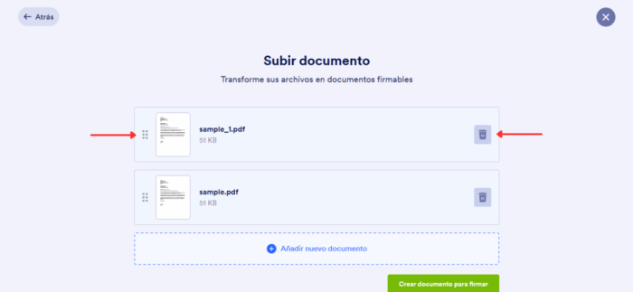 También puede cargar varios documentos a la vez. Se combinarán en un único PDF listo para firmar. Puede cambiar el orden de los archivos arrastrándolos desde el ícono de seis puntos o eliminar los que no necesite.