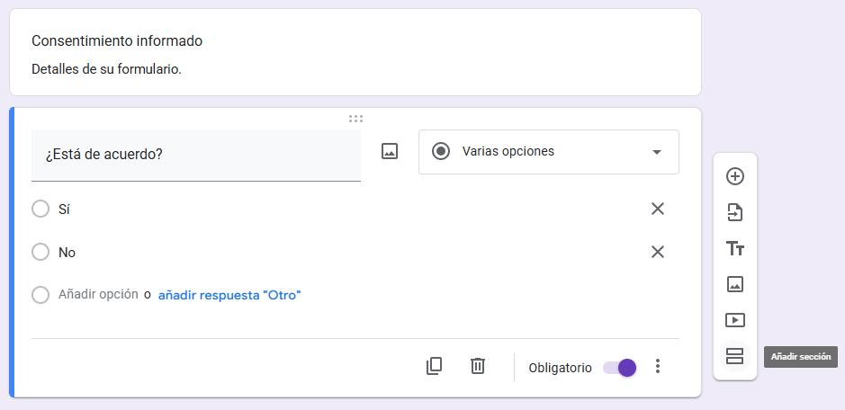- Vuelve a la barra lateral junto a tu pregunta y haz clic en Añadir sección para crear una segunda sección. Esta segunda sección será para aquellos que decidan denegar su consentimiento.