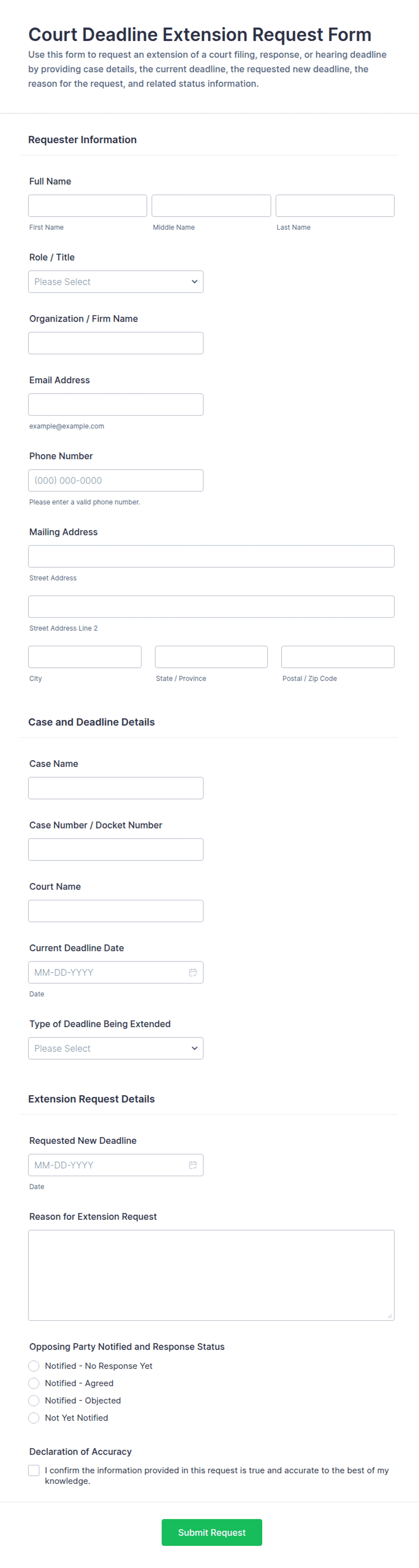 - Legal and administrative: Clients or staff request extensions for document submissions, court filings, or compliance deadlines.