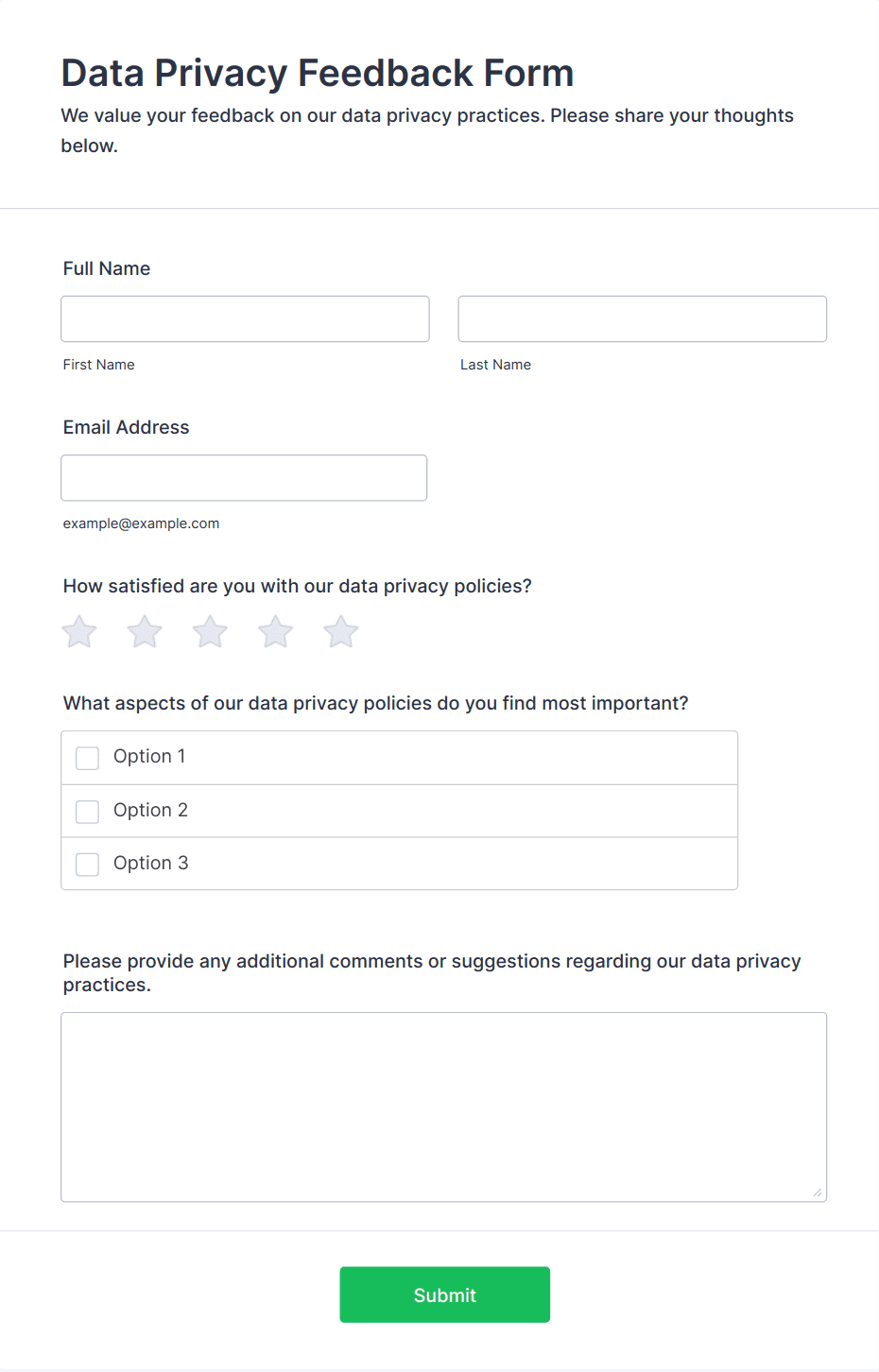 • Product feedback forms may include questions about usability, features, and likelihood to recommend.