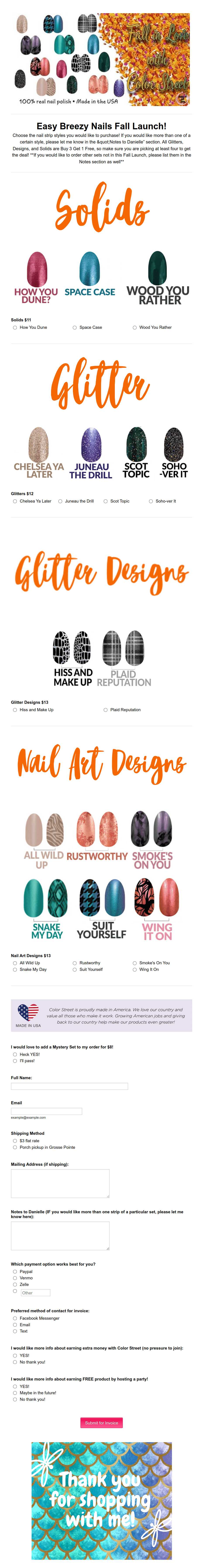A Fall Launch Nails Order Form is a template designed to streamline the process of taking online orders for the Fall launch of new nail products.
