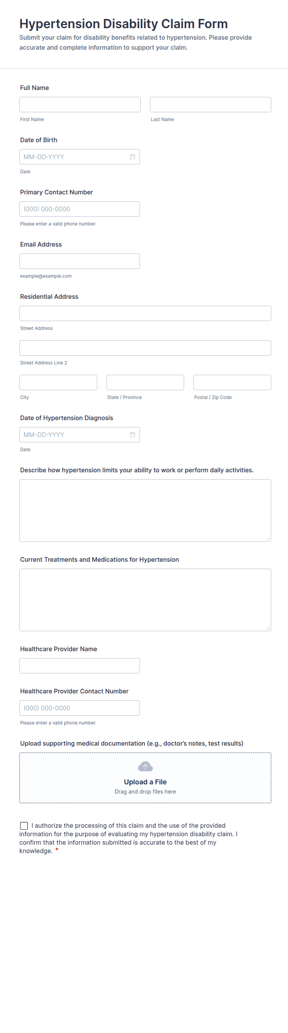 Use this form when someone needs to submit a hypertension-related disability claim for review, or when an organization wants a standardized intake process before requesting follow-ups or additional records.