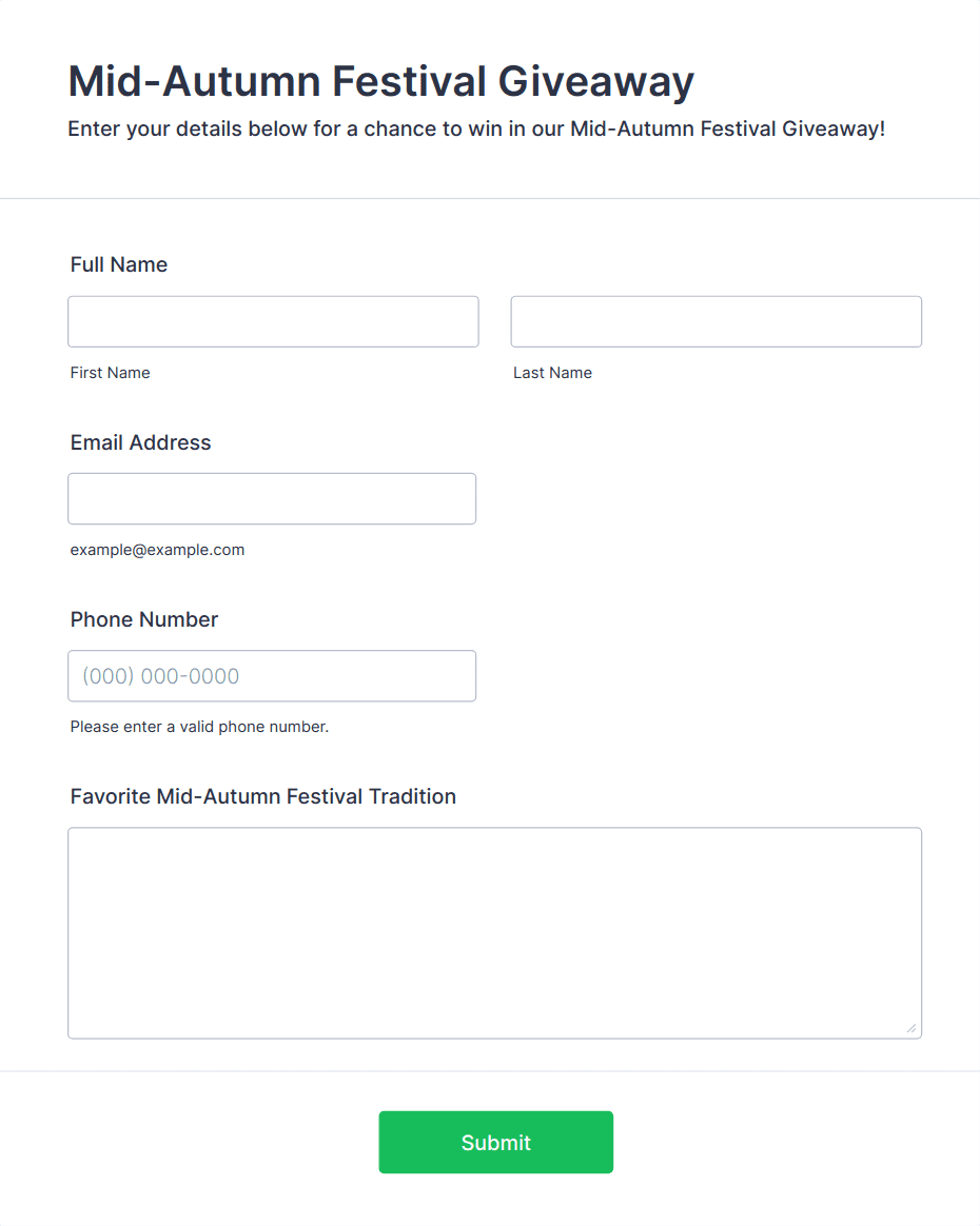 Collect entries for your Mid-Autumn Festival Giveaway with a customizable form. Easily manage submissions and engage participants using Jotform's no-code form builder.