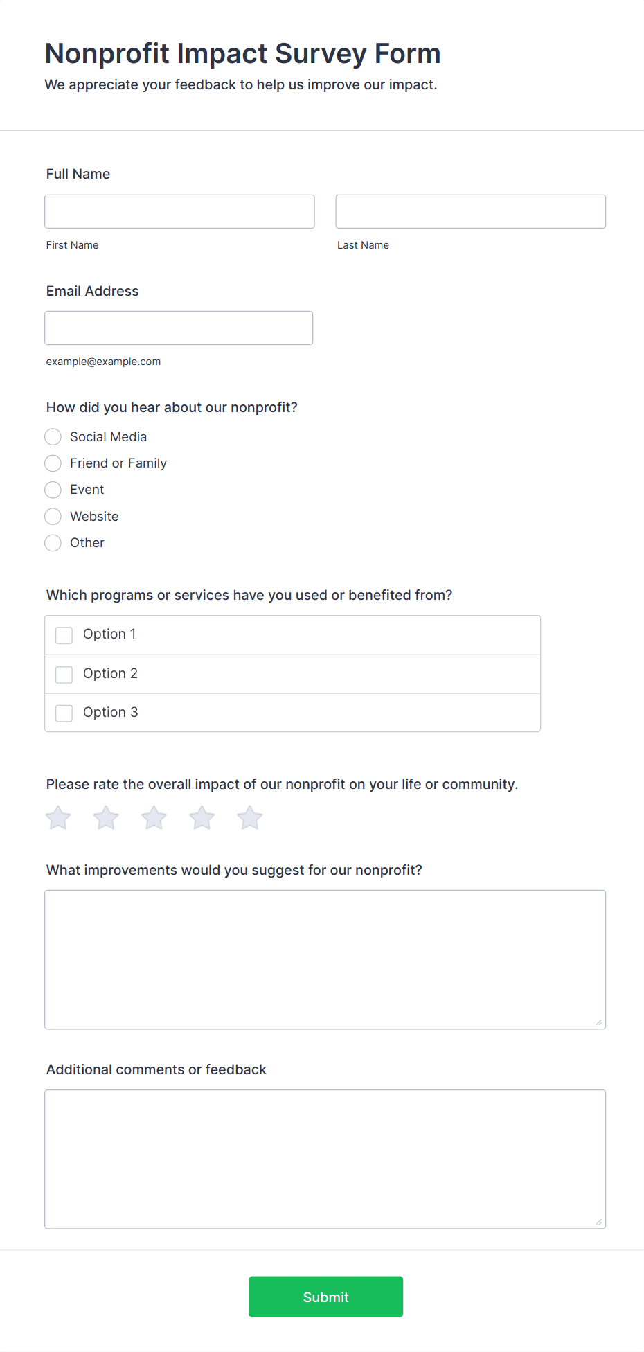 • For customer satisfaction surveys, include Net Promoter Score (NPS) fields or star ratings.