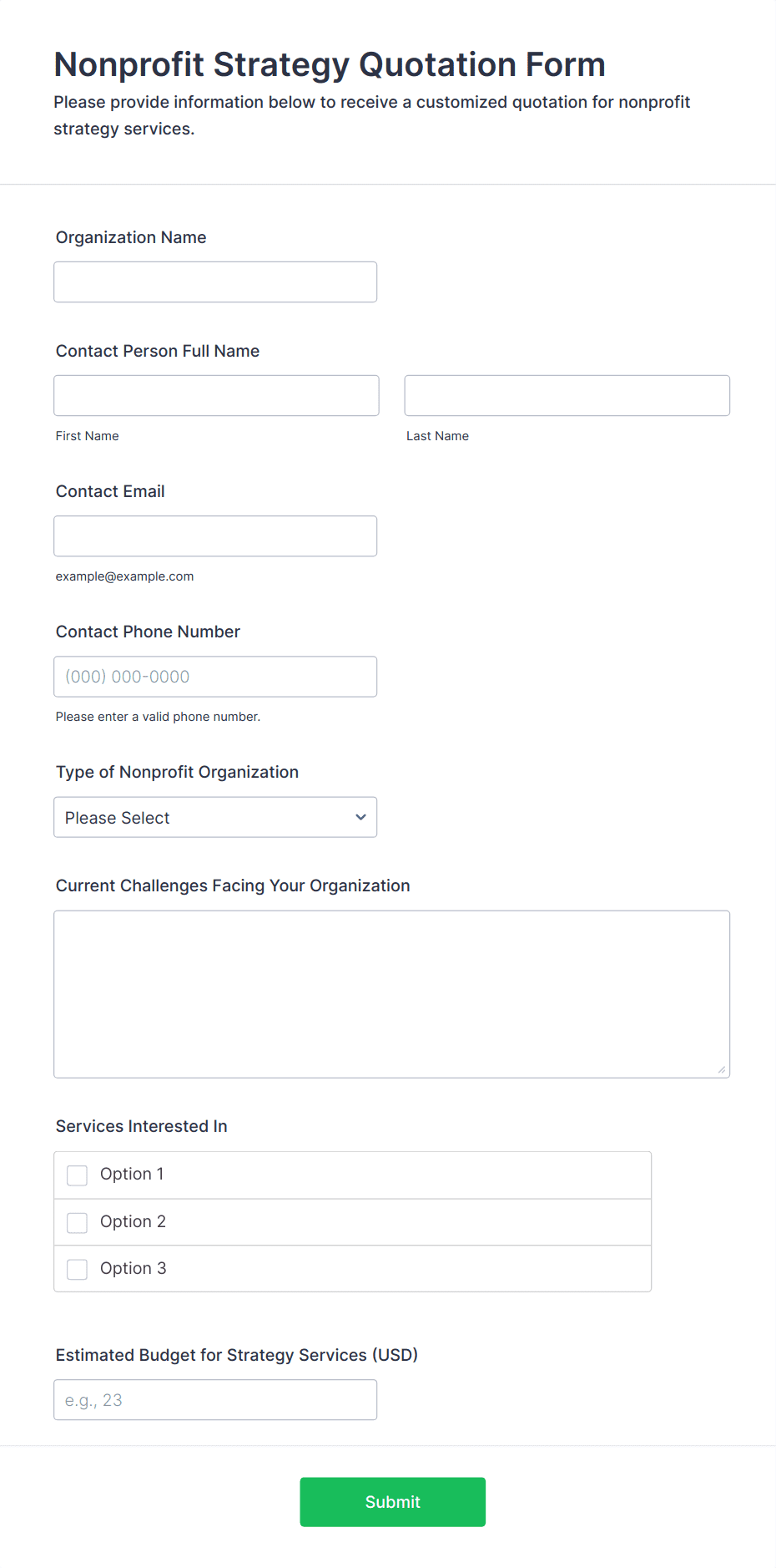 - Client Intake Forms: Focus on collecting contact details, business background, and initial goals.