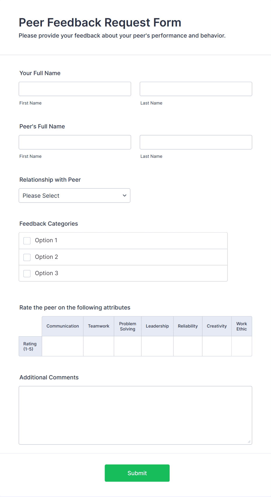 A Peer Evaluation form is a form template designed to streamline the process of collecting feedback and evaluations from peers in the workplace