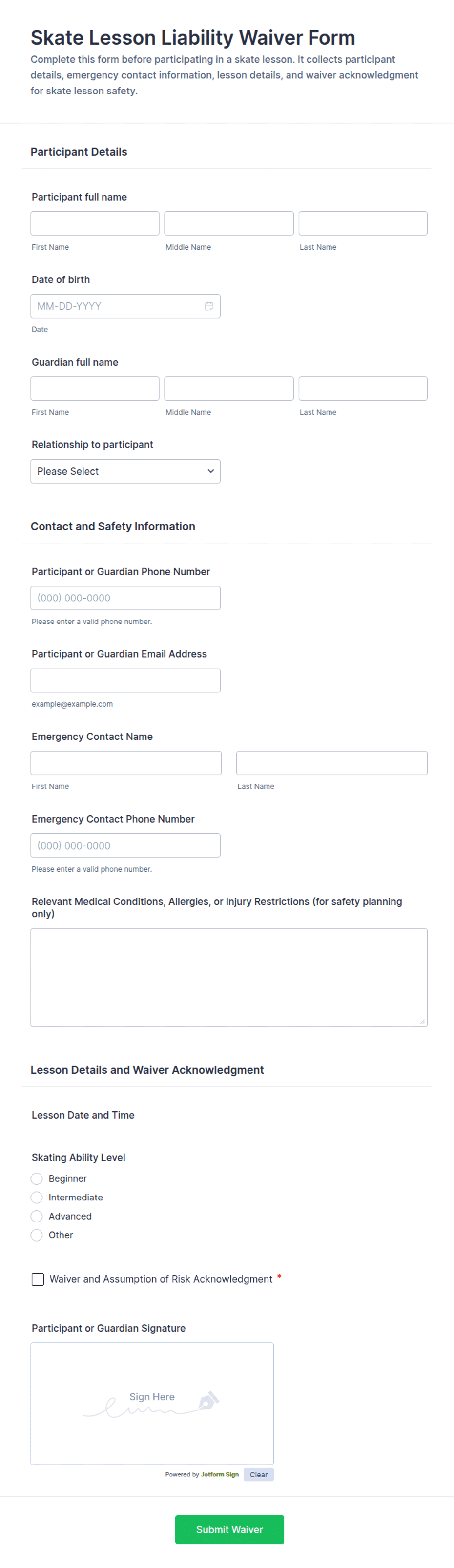 Use the Demo Ride Liability Waiver Form from Jotform to collect participant details, emergency contacts, waiver consent, and e-signatures online with Jotform Form Builder and its no-code, drag-and-drop interface for secure data collection and form submission.