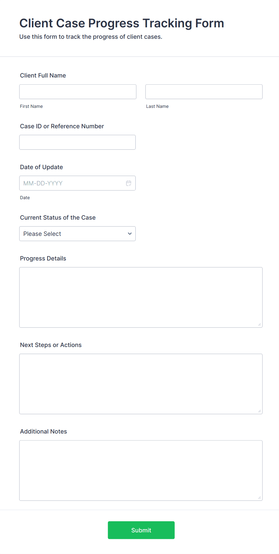 The Client Case Progress Tracking Form is designed to help professionals, such as social workers, counselors, and case managers, monitor the progress of their clients effectively. This form provides a structured approach to track client interactions, milestones, and any relevant updates, ensuring that all critical information is easily accessible in one place. By utilizing this form, users can streamline their case management processes and enhance communication with clients, fostering a more organized and efficient workflow.