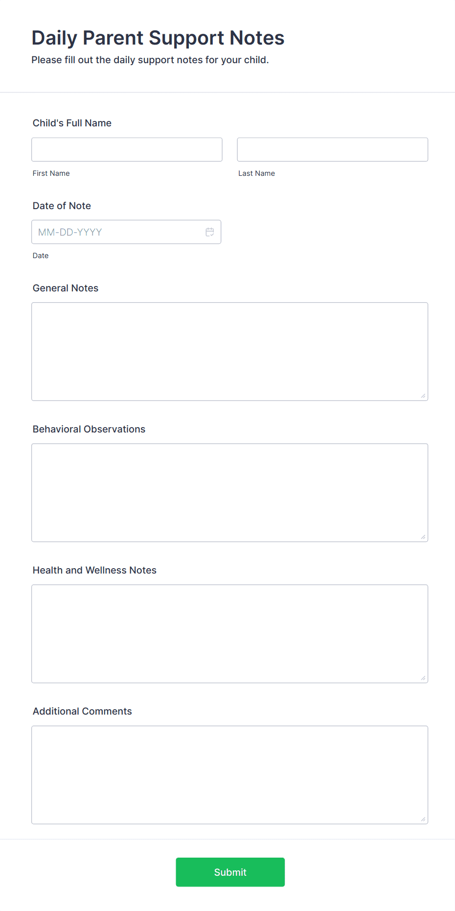 The Daily Parent Support Notes is a valuable tool designed for educators and caregivers to communicate effectively with parents about their children's daily activities, progress, and any concerns. This form template is perfect for teachers, daycare providers, and after-school program coordinators who want to keep parents informed and engaged in their child's development. By utilizing this customizable form, you can ensure that important information is shared in a structured manner, fostering a strong partnership between home and school.