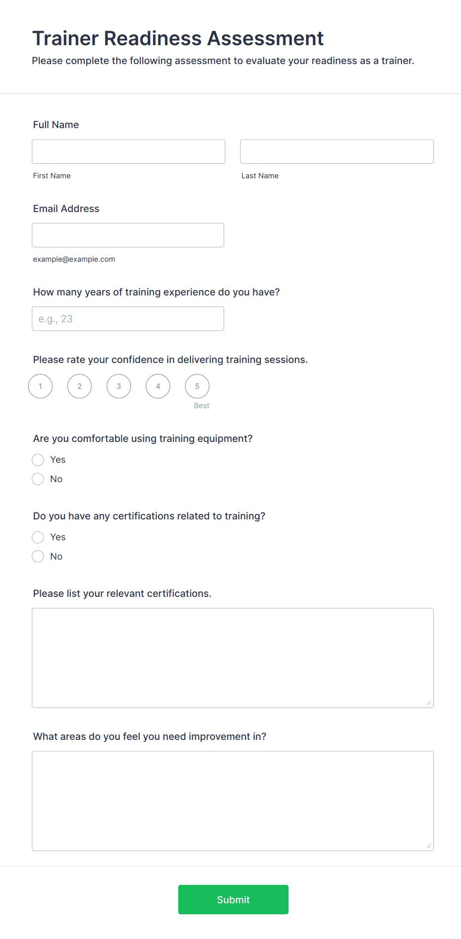By following these steps, you can create tailored Assessment Training Forms that streamline the evaluation process, provide actionable insights, and enhance the overall training experience for both facilitators and participants.