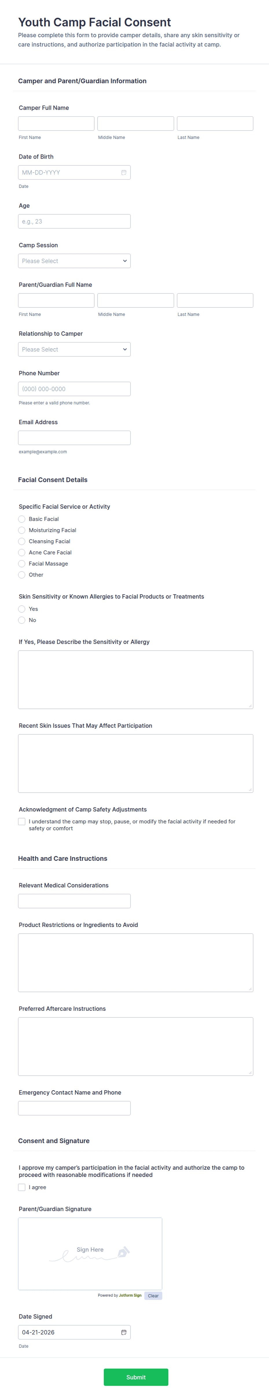 Youth Camp Facial Consent Form helps camps collect parent or guardian approvals online and organize care instructions for supervised facial activities across camp sessions with Jotform.