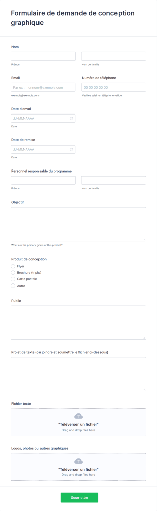 Un Agent IA de Demande de Conception Graphique est un assistant interactif conçu pour simplifier le processus de collecte d'informations concernant les demandes de conception. Cet agent engage les clients dans des conversations fluides pour recueillir des détails essentiels, tels que le type de produit de conception souhaité, les dates de remise, et d'autres spécifications pertinentes. Cela permet aux entreprises de mieux comprendre les besoins de leurs clients et d'améliorer l'expérience utilisateur dès le premier contact.