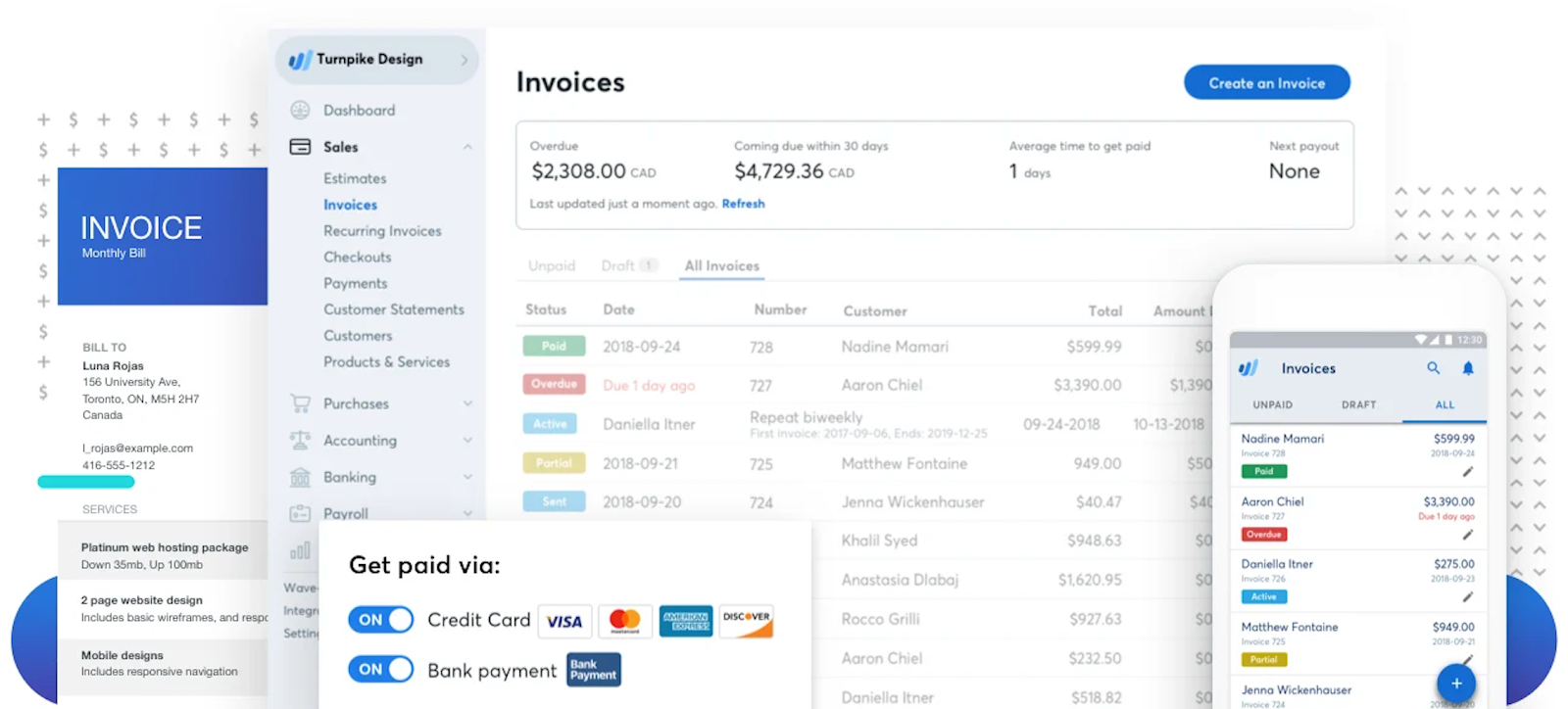 Wave propose un forfait de démarrage gratuit pour les entreprises qui débutent leurs activités ou qui ont juste besoin des fonctionnalités essentielles. Vous pouvez également opter pour le forfait Pro au prix de 16 $ par mois si vous souhaitez bénéficier de fonctionnalités supplémentaires, telles que l’importation automatique des transactions bancaires, les rappels automatiques pour les factures en retard et la possibilité d’offrir des paiements en ligne à prix réduit aux clients et aux consommateurs.