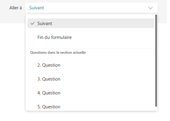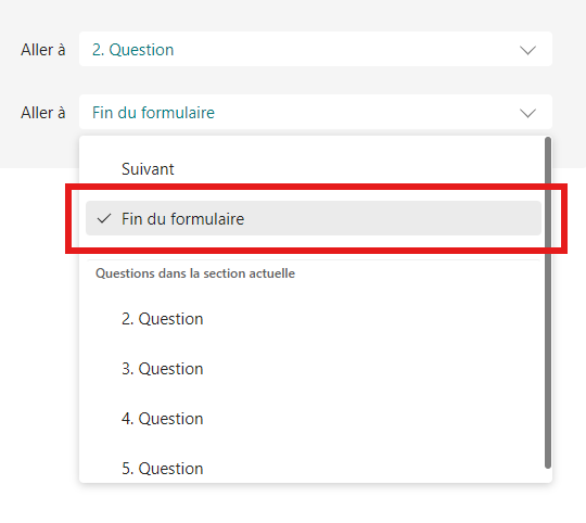 Enfin, vous avez la possibilité de rediriger l’utilisateur vers la fin du formulaire. Cette fonctionnalité est particulièrement utile pour les formulaires complexes comportant plusieurs sections, car elle permet aux utilisateurs d’ignorer les questions qui ne les concernent pas. Par exemple, vous pouvez inviter l’utilisateur à accéder à une section adaptée à son profil démographique, et après avoir répondu à la dernière question de cette section, il sera automatiquement dirigé vers la conclusion du formulaire.