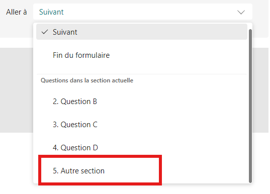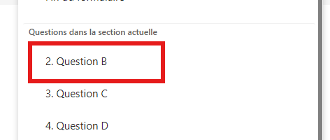 Vous pouvez également diriger l’utilisateur vers une autre section du formulaire. Cette option est pratique si vous souhaitez poser des questions spécifiques à différents groupes. Par exemple, vous pouvez organiser les questions en sections selon des données démographiques particulières, comme les tranches d’âge.