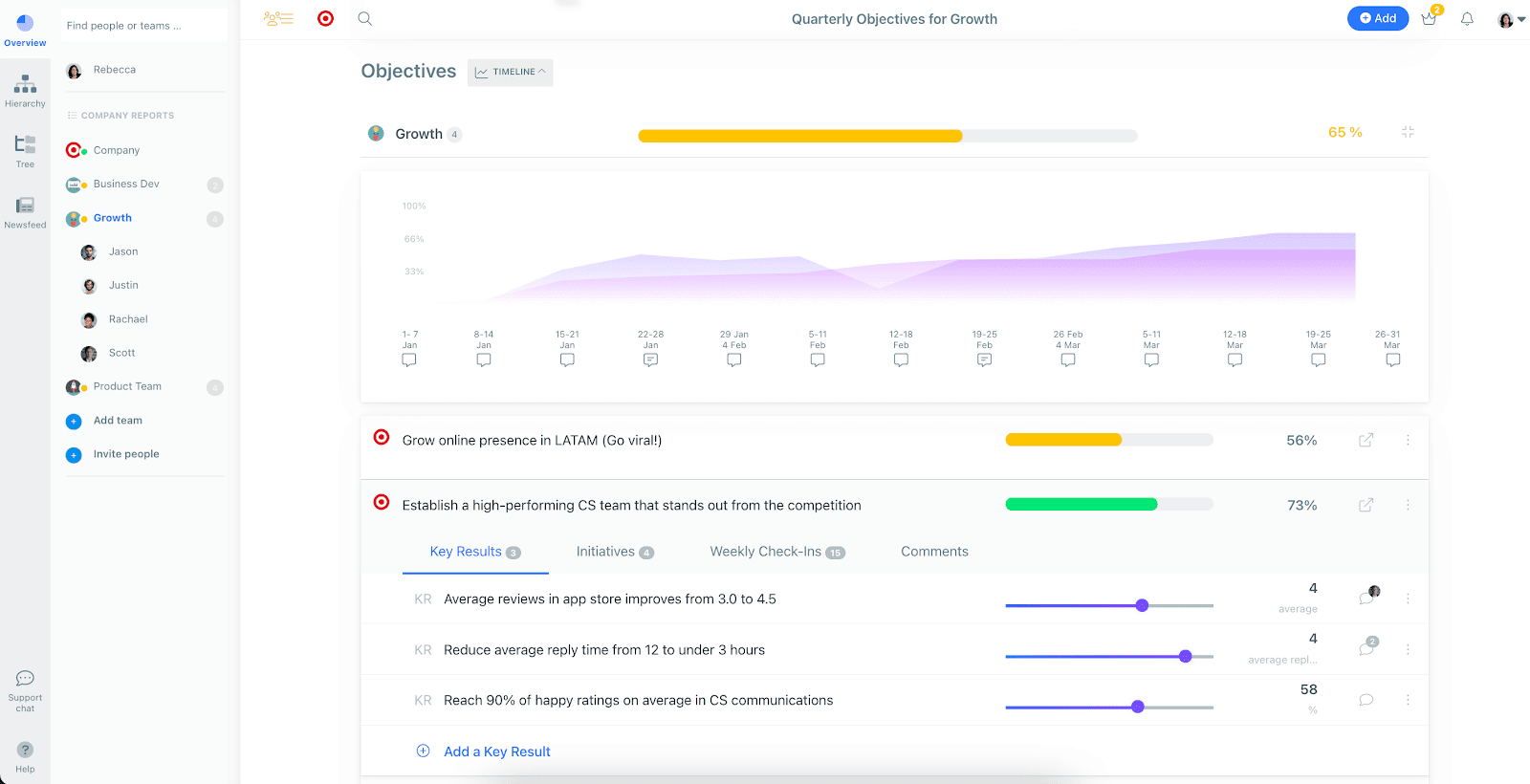 - Avantages : excellente solution pour les équipes qui souhaitent rester alignées sur les tâches et les objectifs hebdomadaires ; interface claire et simple qui encourage une utilisation régulière ; suivi efficace des OKR (objectifs et résultats clés) pour les entreprises axées sur les objectifs.