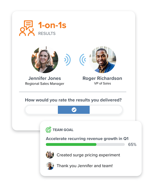 - Principales fonctionnalités : évaluations de performance avec commentaires en temps réel et modèles personnalisés, enquêtes d’engagement et contrôles d’impulsion avec analyses détaillées, ordres du jour de réunions individuelles et mises à jour pour un suivi facile des commentaires