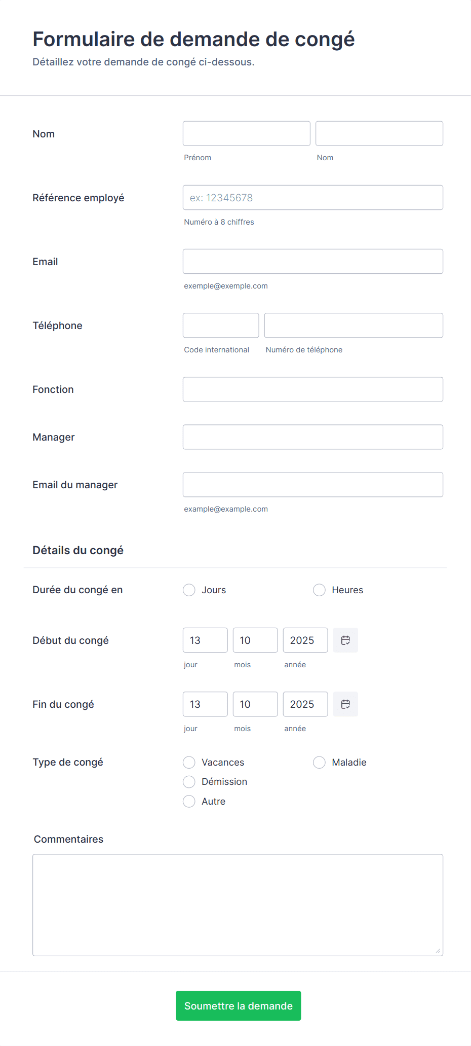 Il existe de nombreux types de formulaires RH ! Ceux-ci peuvent inclure des formulaires de demande d'emploi, des lettres d'offre, des formulaires d'informations sur les employés, des formulaires de présence ou des contrats. Les RH seront souvent chargées de gérer les formulaires d'évaluation des performances, les demandes de congés, les remboursements et les formulaires de formation. Les processus d’embauche et de licenciement nécessitent également souvent une série de formulaires RH.