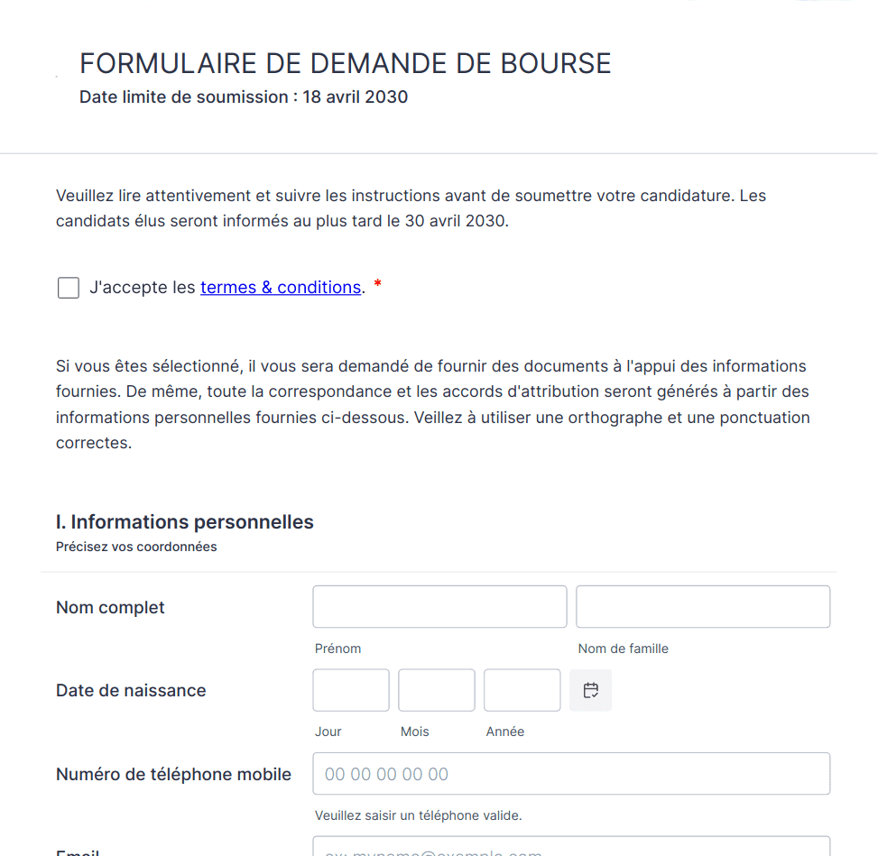 En résumé, les formulaires de demande de bourse peuvent être adaptés pour répondre à un large éventail de scénarios, garantissant que les organisations collectent les bonnes informations selon leurs critères de sélection spécifiques.