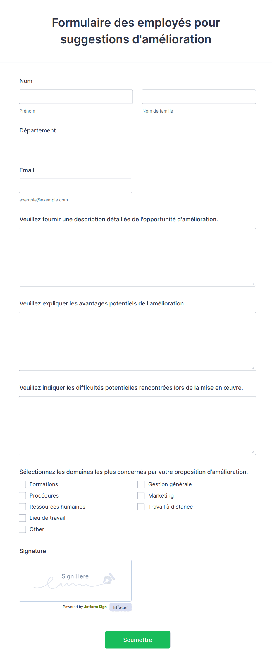 Ce formulaire des employés pour suggestions d'amélioration recueille les commentaires des employés sur la manière d'améliorer le lieu de travail. Si vous êtes employeur ou responsable du service des ressources humaines d'une entreprise, ce formulaire gratuit de suggestions d'amélioration des employés vous aidera à recueillir facilement des commentaires en ligne. Il vous suffit de personnaliser le formulaire en fonction de vos besoins, de le partager avec vos employés, et vous recueillerez des commentaires et des suggestions en un rien de temps ! Les soumissions seront envoyées et stockées dans votre compte Jotform sécurisé, facilement accessible depuis n'importe quel appareil et partageable avec d'autres membres du personnel.