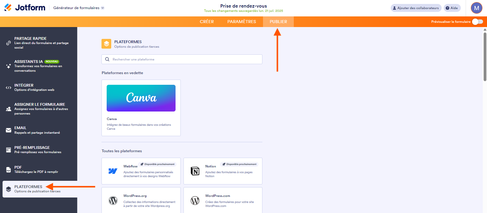 - Accédez à votre formulaire dans le Générateur de formulaires Jotform et cliquez sur l’onglet Publier.
