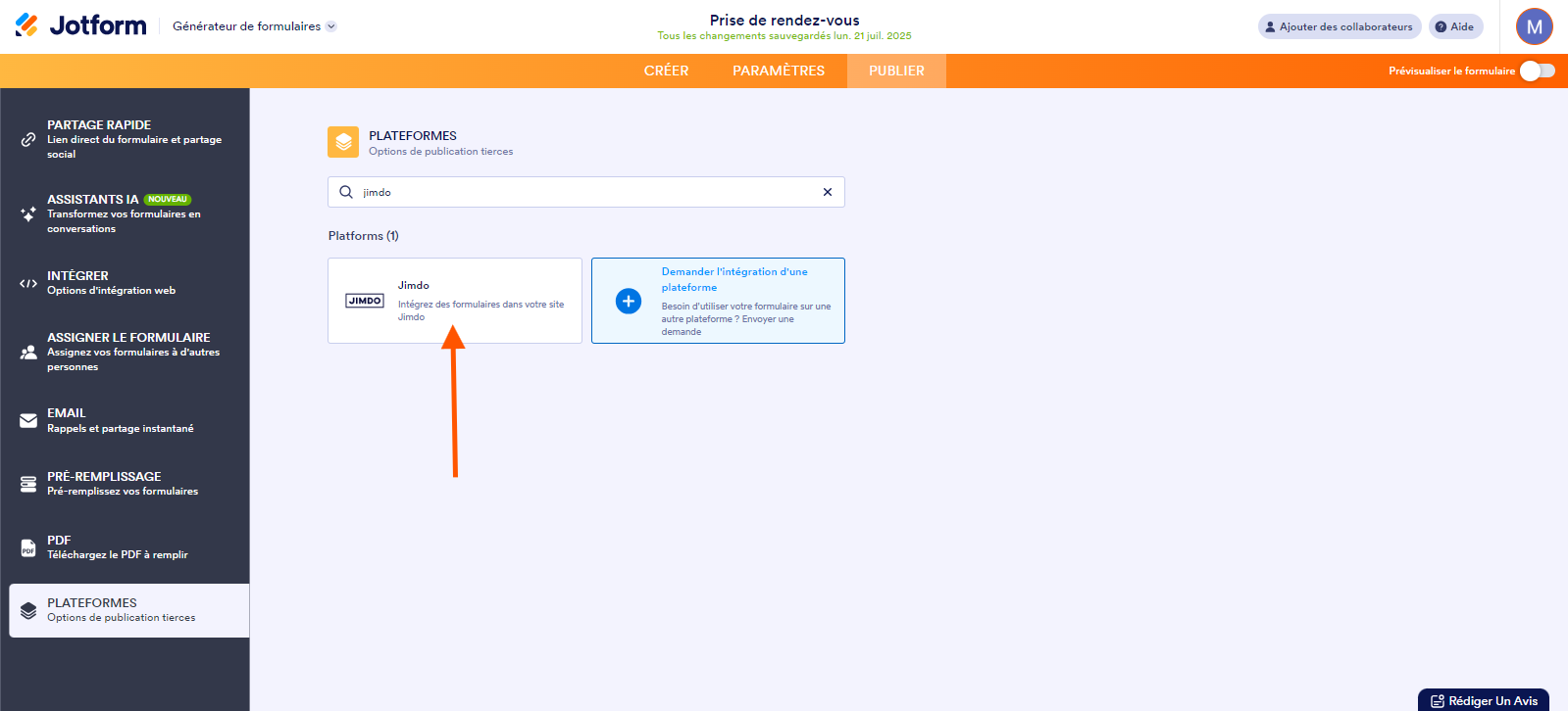 - Sélectionnez Jimdo. Vous pouvez saisir Jimdo dans la zone de recherche pour le trouver facilement.
