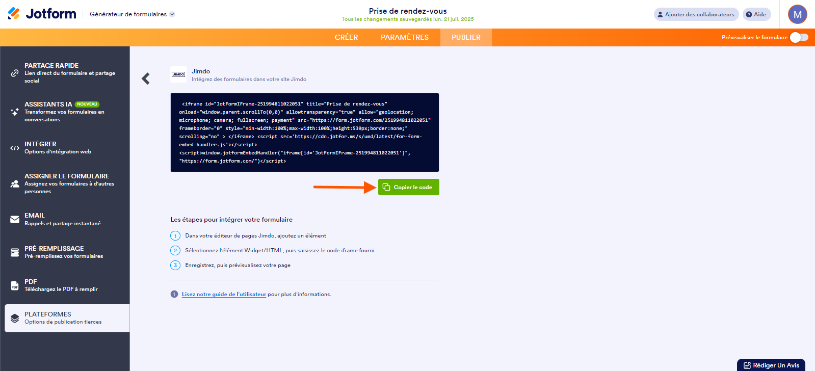Suivez ces étapes pour copier le code d’intégration de votre site Jimdo Creator :