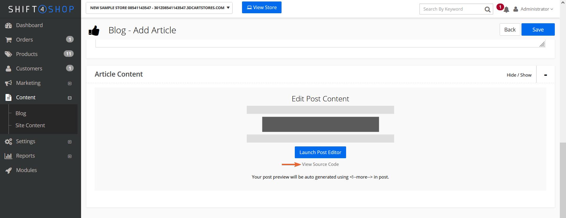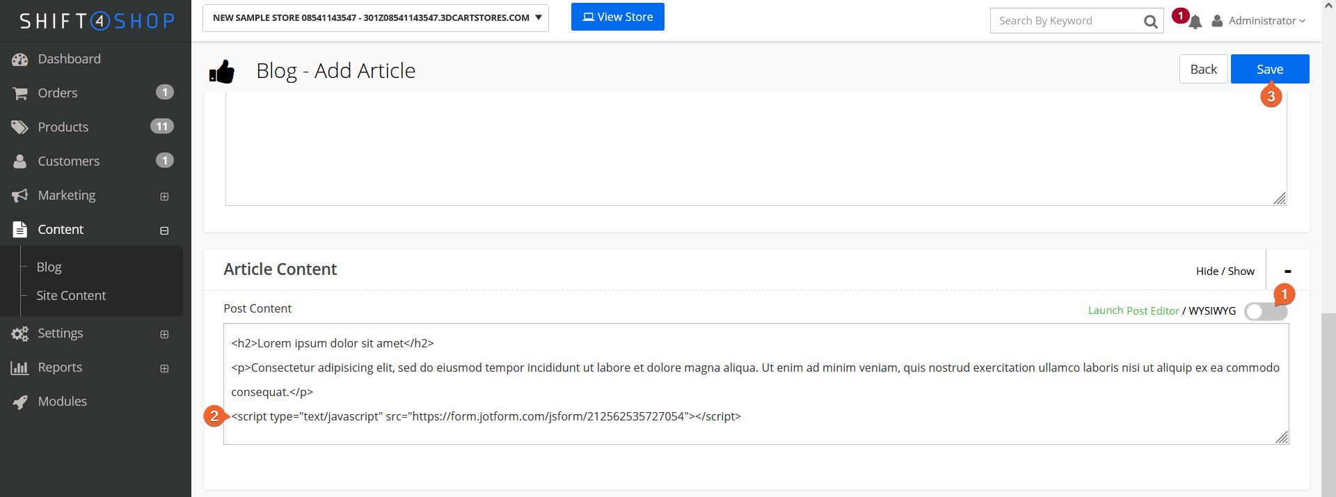 Pour pouvoir suivre ce guide, vous devez être connecté à votre tableau de bord Shift4Shop en tant qu’administrateur. Le formulaire sera ajouté sous forme d’article de blog.