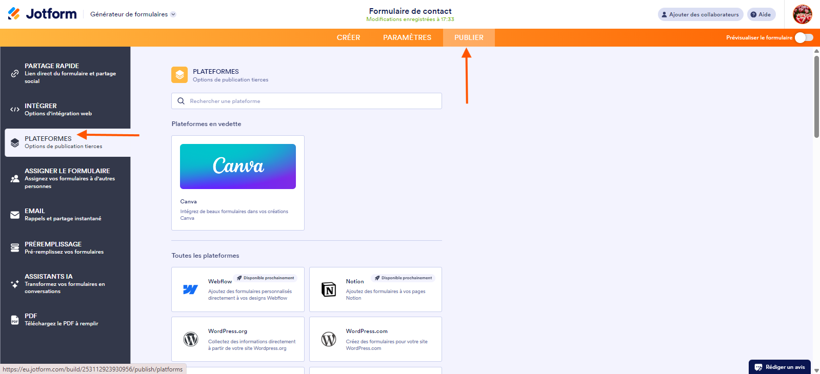 Pour obtenir le code d’intégration de votre formulaire, procédez comme suit :