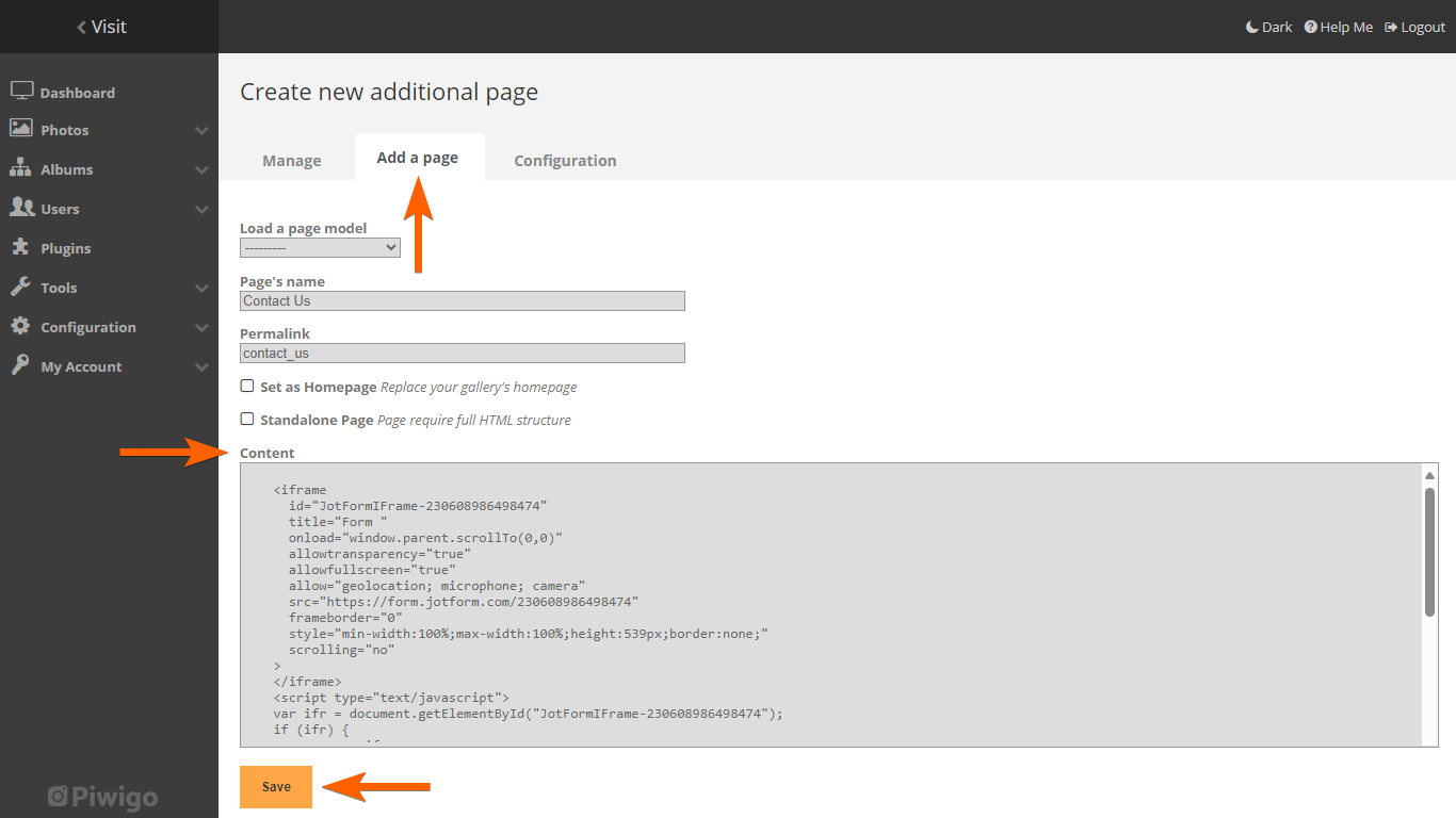 Pour ajouter votre formulaire à votre site Piwigo, procédez comme suit :