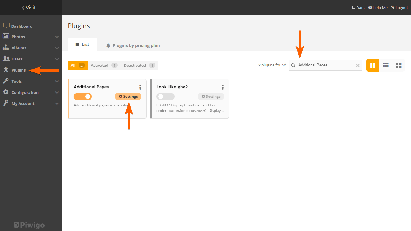 - Sur votre page d’administration Piwigo, accédez à Plugins dans le menu de gauche.
