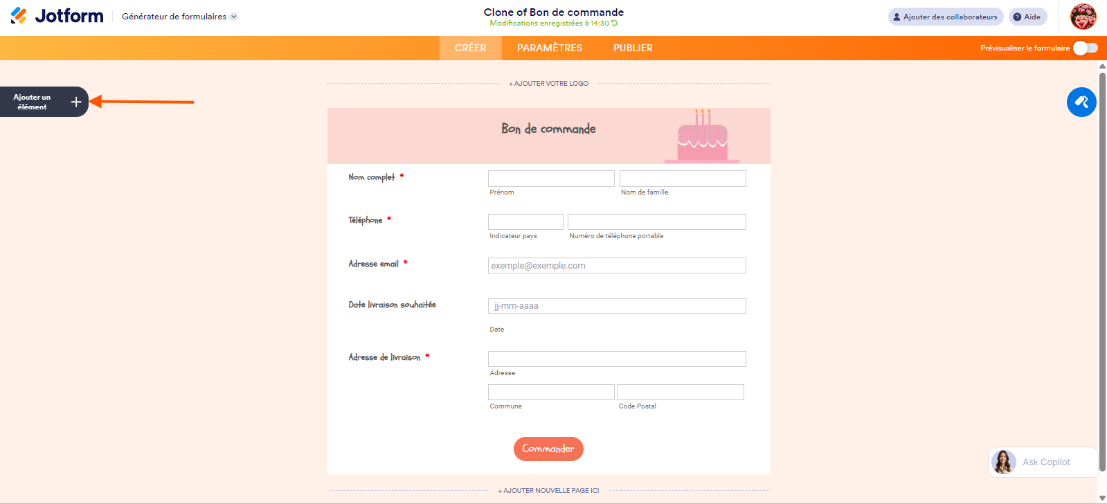 - Accédez à votre formulaire dans le Générateur de formulaires Jotform et cliquez sur le bouton Ajouter un élément à gauche de la page.