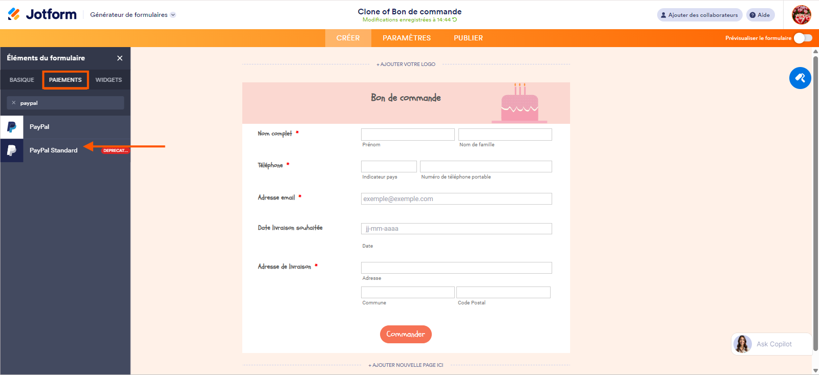 - Dans le volet Éléments de formulaire, cliquez sur l’onglet Paiements et recherchez PayPal Standard. Cliquez dessus afin de l’ajouter à votre formulaire.