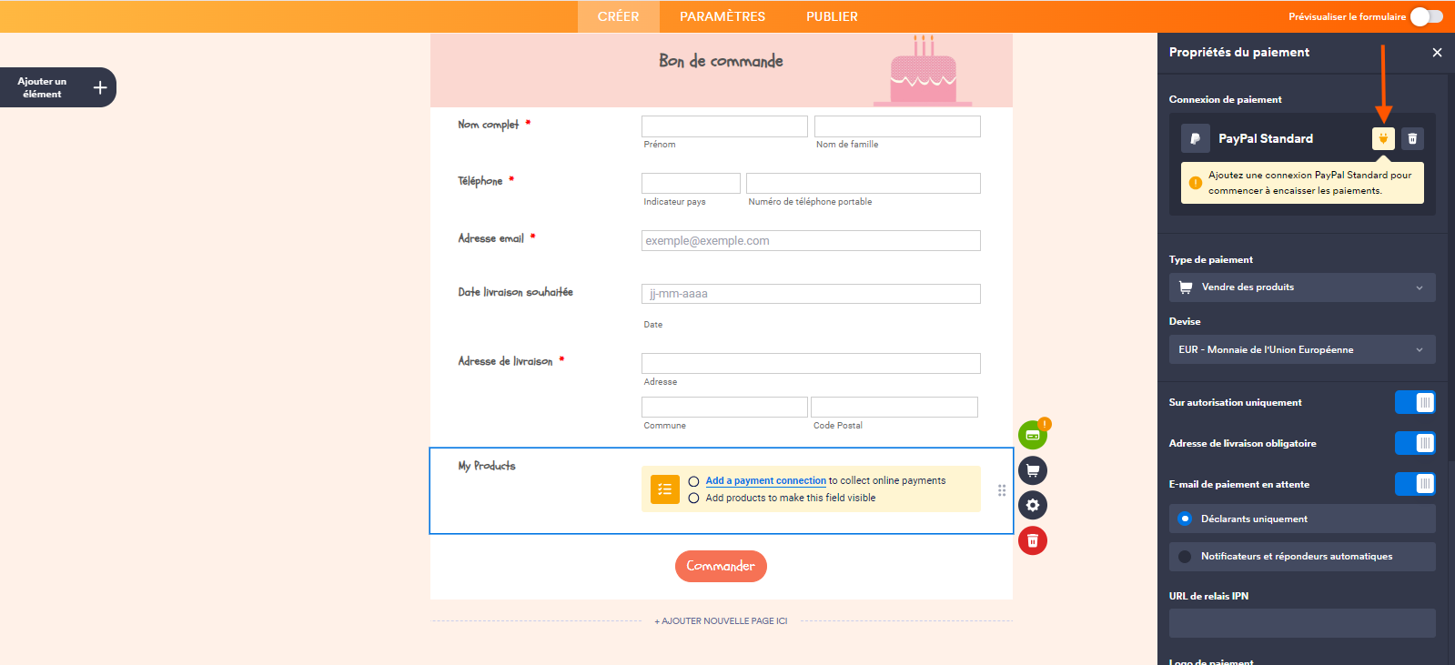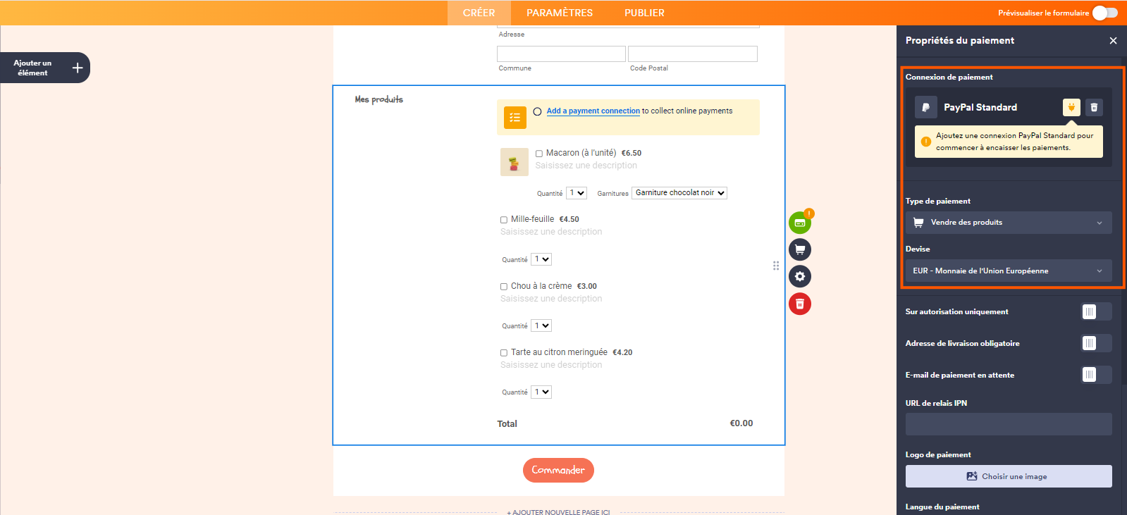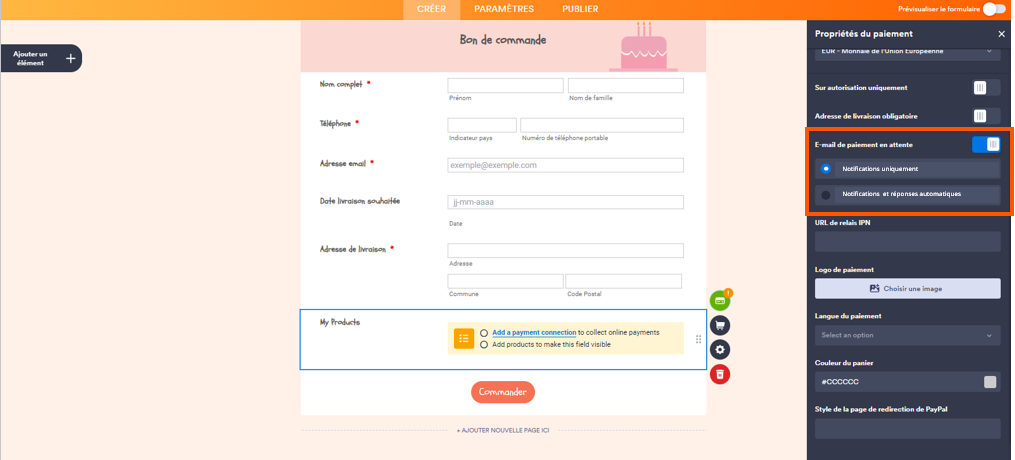 - Dans le volet Propriétés du paiement qui s’ouvre à droite du formulaire, configurez les éléments suivants :