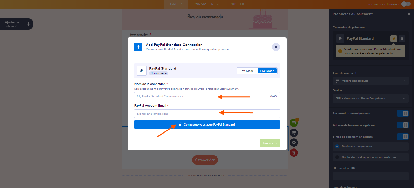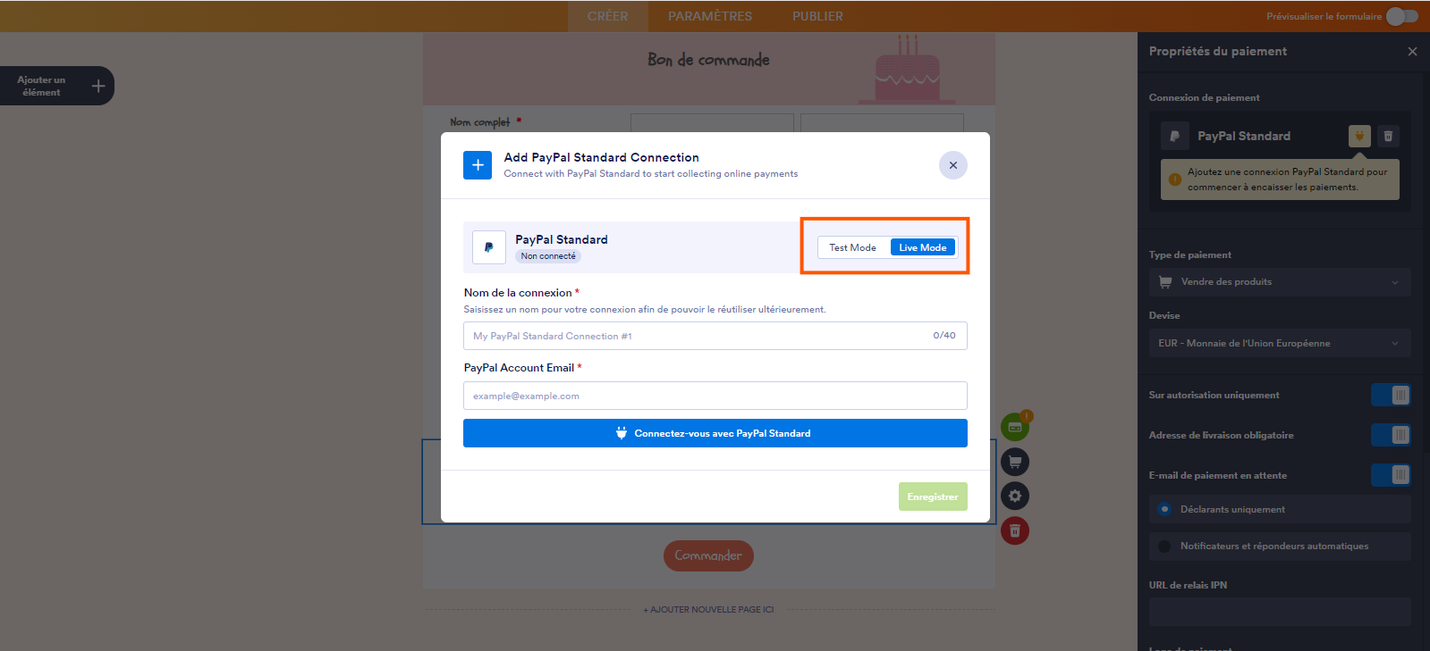 - Dans la fenêtre modale Ajouter une connexion à PayPal Standard, cliquez sur Test Mode ou Live Mode afin de sélectionner l’environnement de votre connexion de paiement.