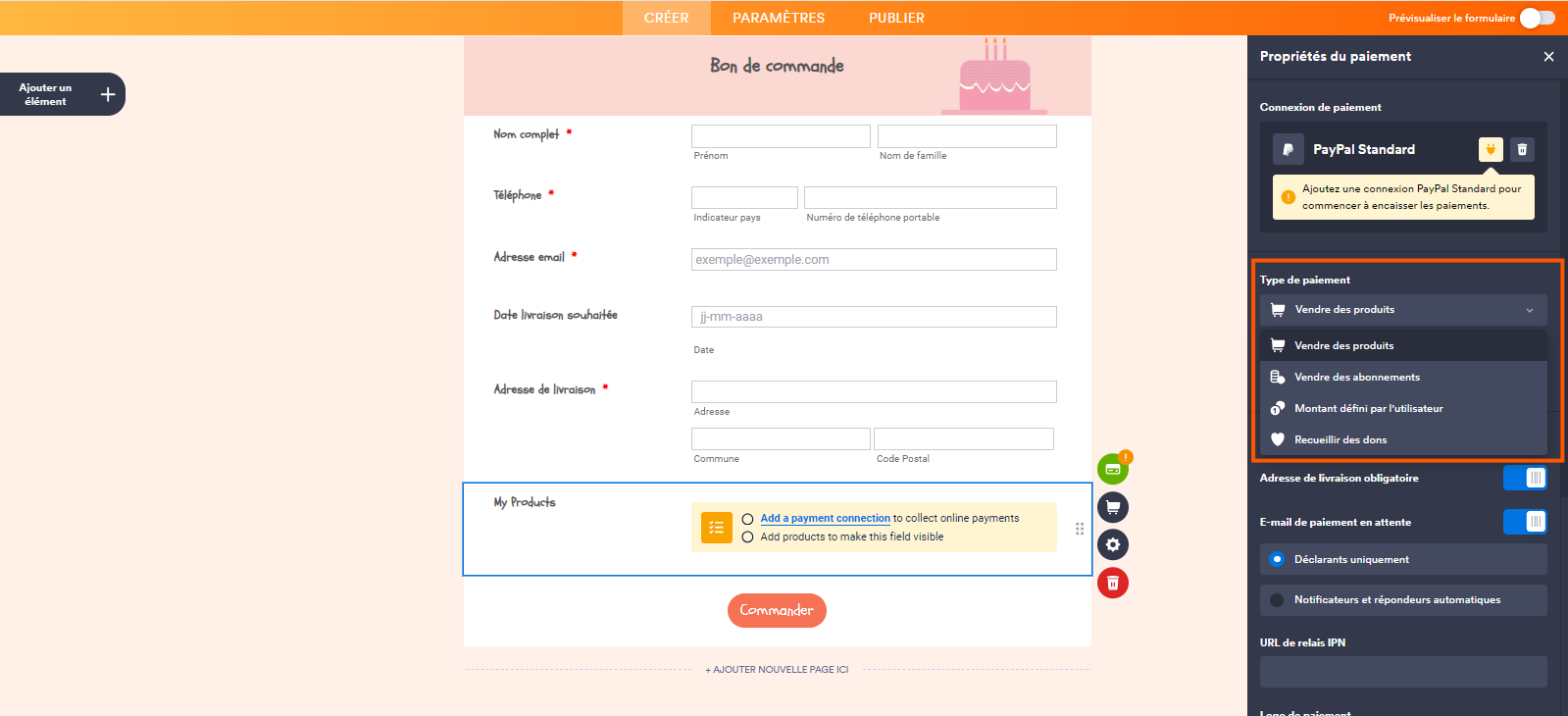 - Type de paiement : choisissez le type de paiement que vous souhaitez percevoir. vous avez le choix entre : Vente de produits, Vente d’abonnements, Montant défini par l’utilisateur et Recueillir des dons.