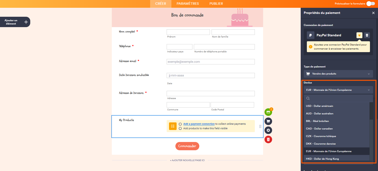 - Dans le menu déroulant Devise, sélectionnez l’une des devises disponibles avec l’intégration. Consultez la page Devises prises en charge par PayPal pour obtenir la liste complète.
